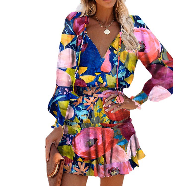 an women’s summer new long -sleeved V -neck trend fashion minimalist printed slim dress 661