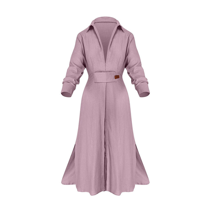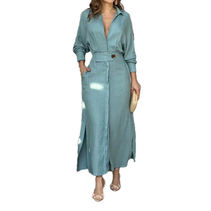an women’s summer new temperament V -neck high -waisted long -sleeved pocket solid color cardigan dress