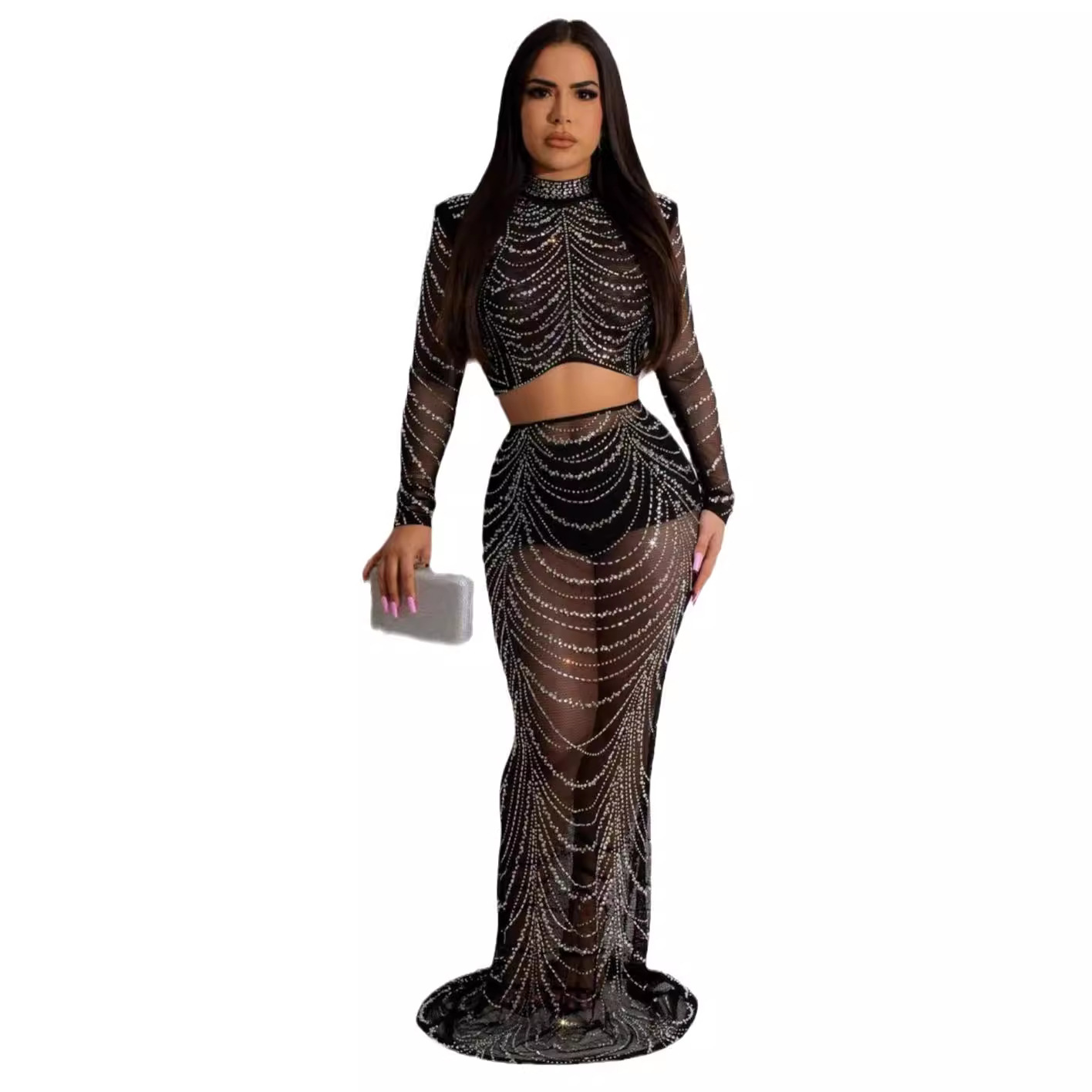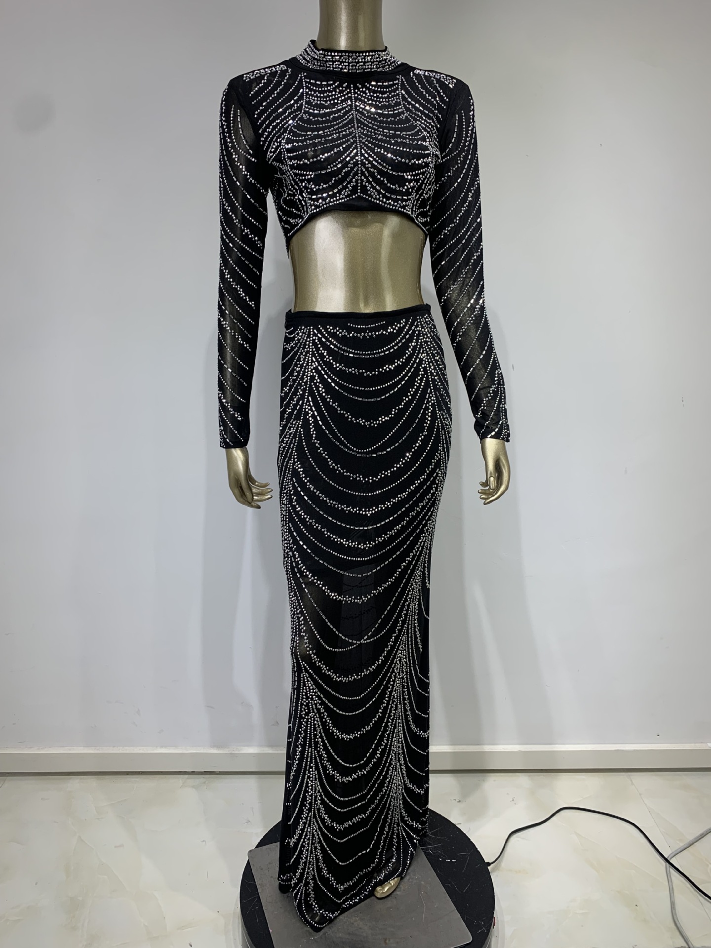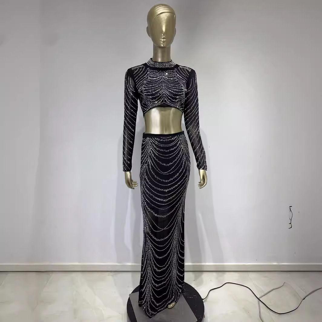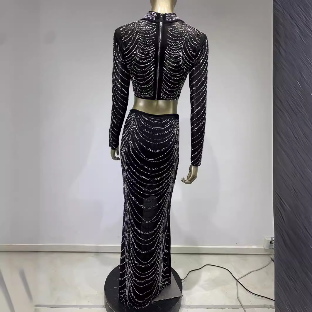 Hot Sale Evening Dress an sexy perspective rhinestone short top high waist skirt suits