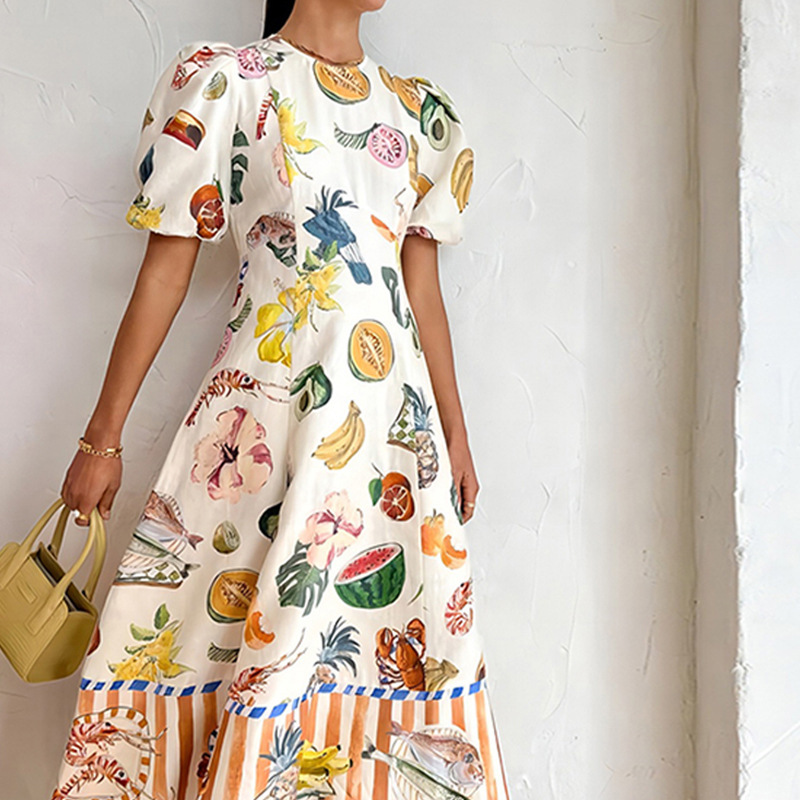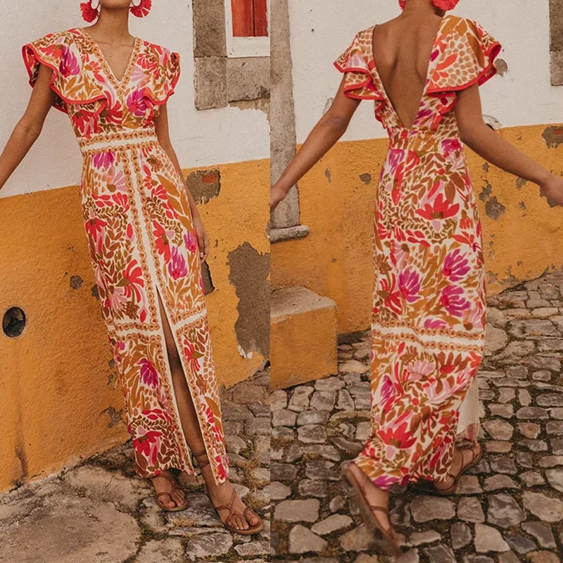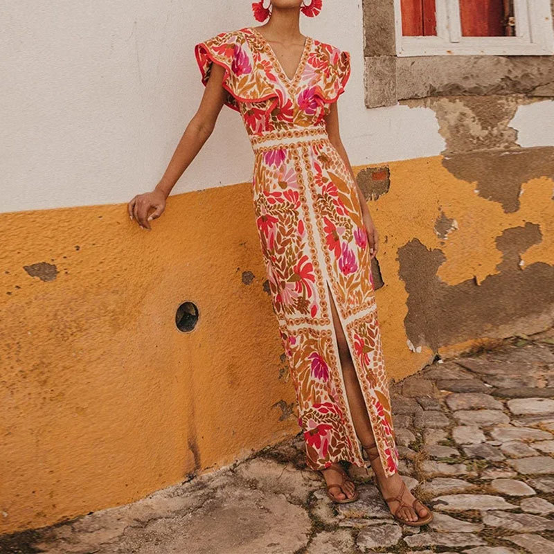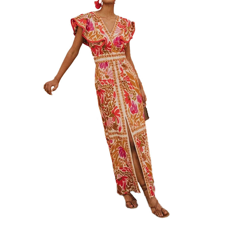 new hot -selling retro printed V -neck long skirt fashion elegant high waist slim dress
