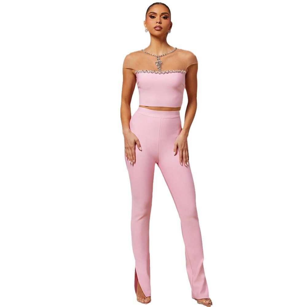 New product explosion pink bage pants set an high street rhinestone top trousers two -piece suit
