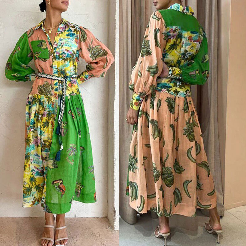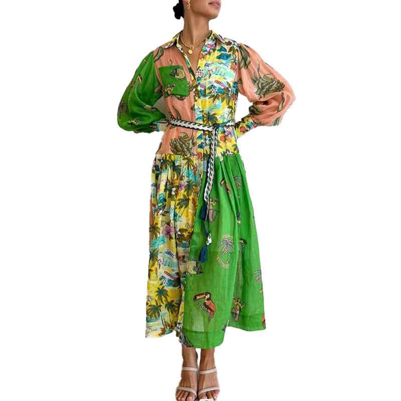 Speed on the new an summer new women’s casual personality printing single buckle long -sleeved dress