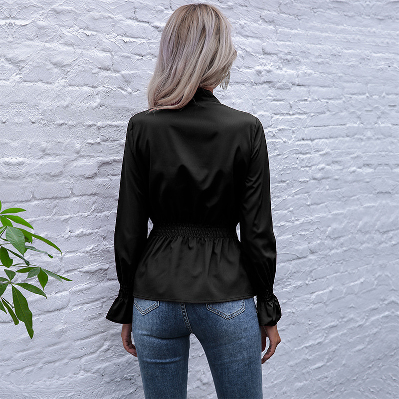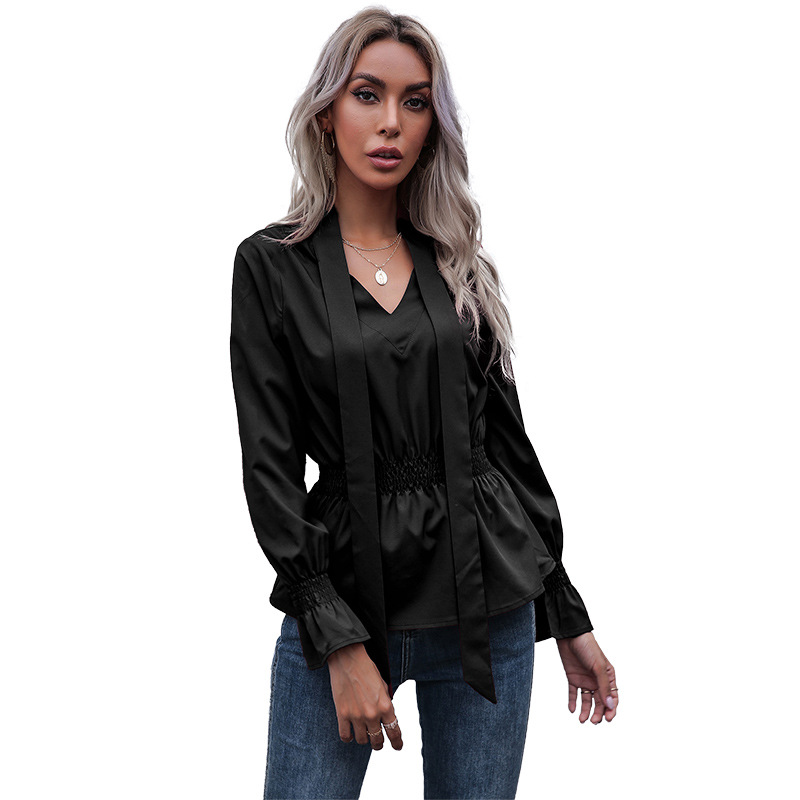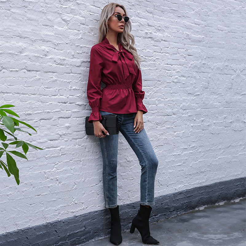 Spring an solid color slim -fitting tight waist horn long -sleeved bow lace -up shirt female