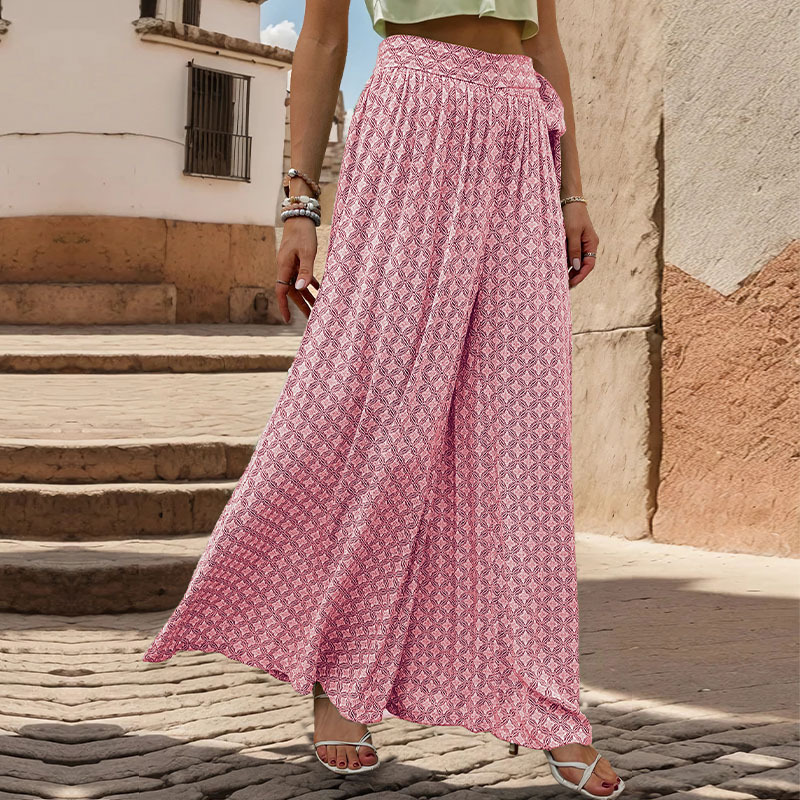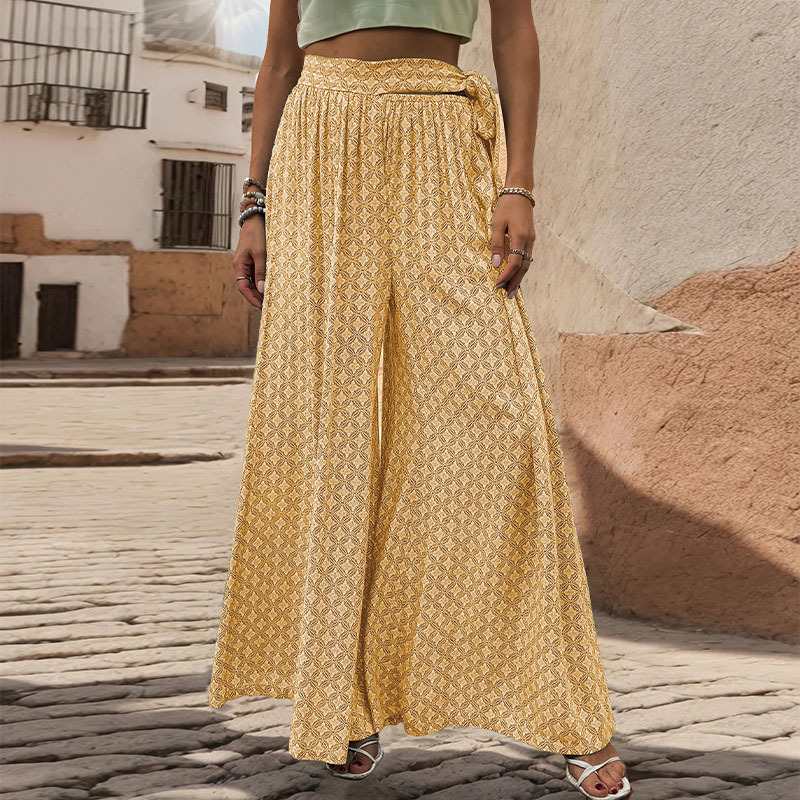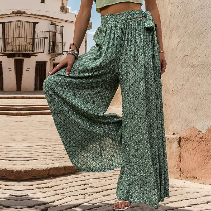 Summer new loose wide -leg pants an explosion TEMU women’s lace -up high -waisted casual printed trousers